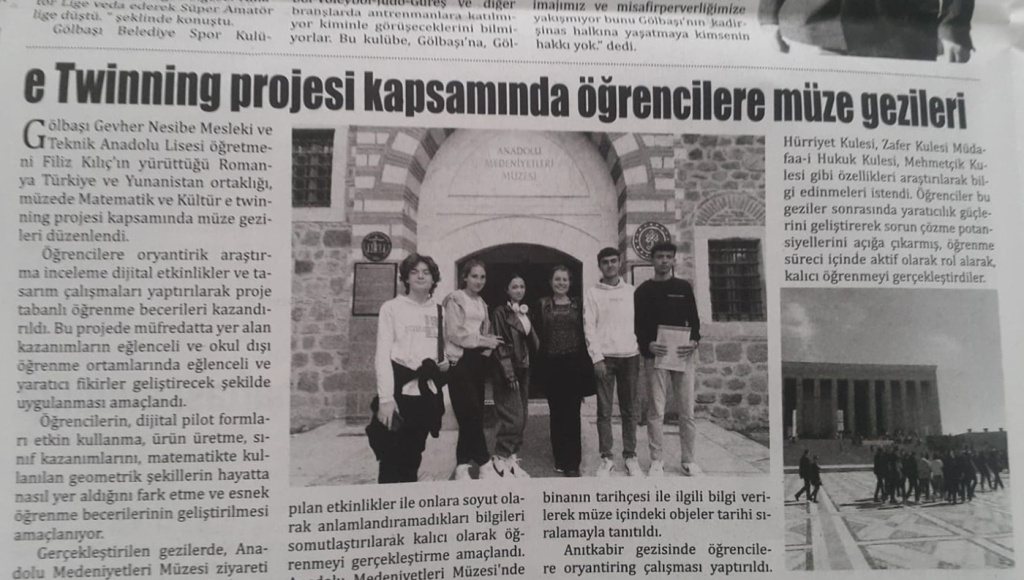 Okulumuz öğretmeni Filiz KILIÇ'ın yürüttüğü Romanya Türkiye ve Yunanistan ortaklığı müzede matematik ve kültür e twinning projesi kapsamında müze Gezileri düzenlenmiş öğrencilere oryantirik araştırma inceleme dijital etkinlikler ve tasarım çalışmaları yaptırılarak proje tabanlı öğrenme becerileri kazandırılmıştır.
