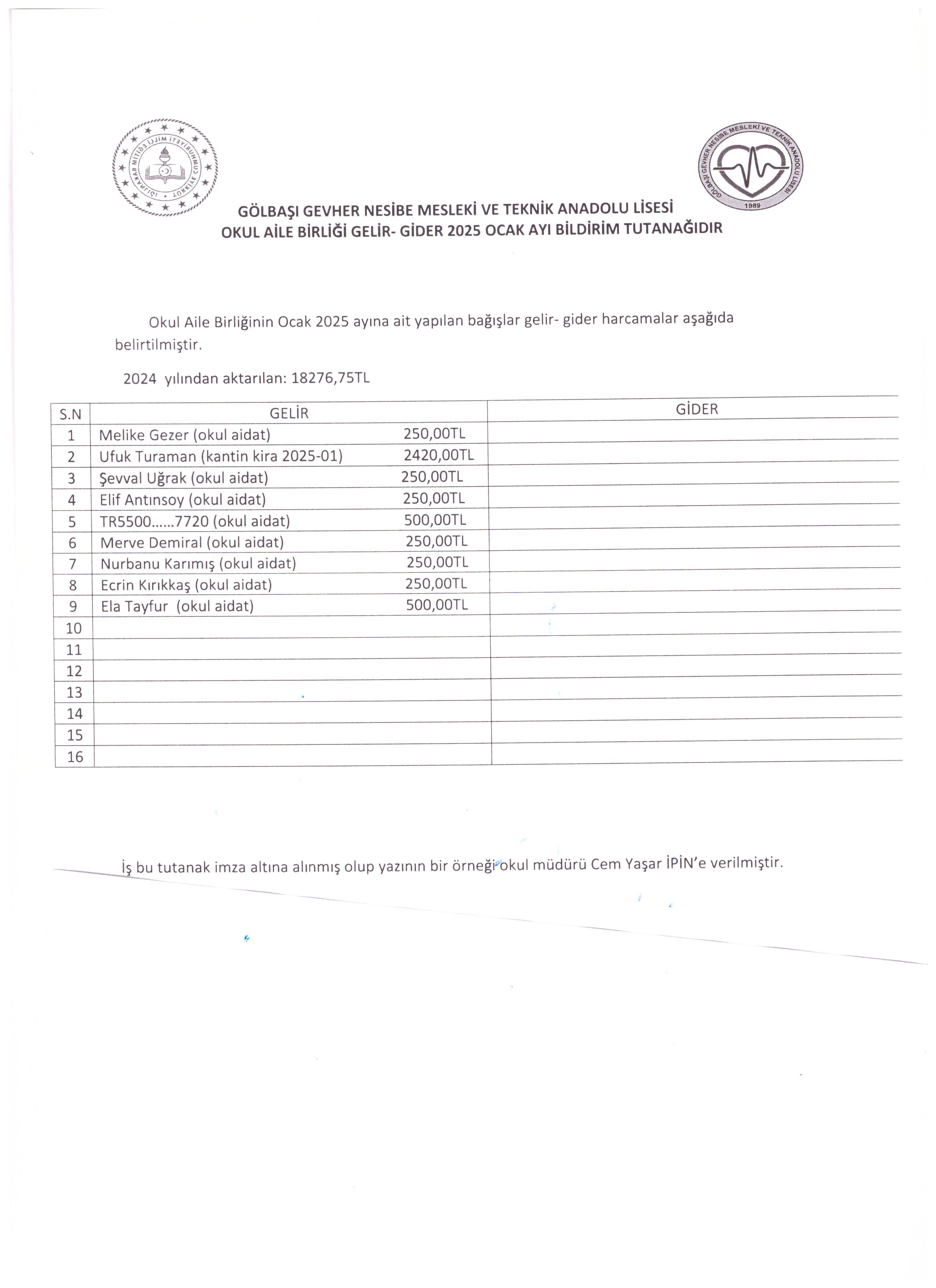 2025 ocak gelir gider