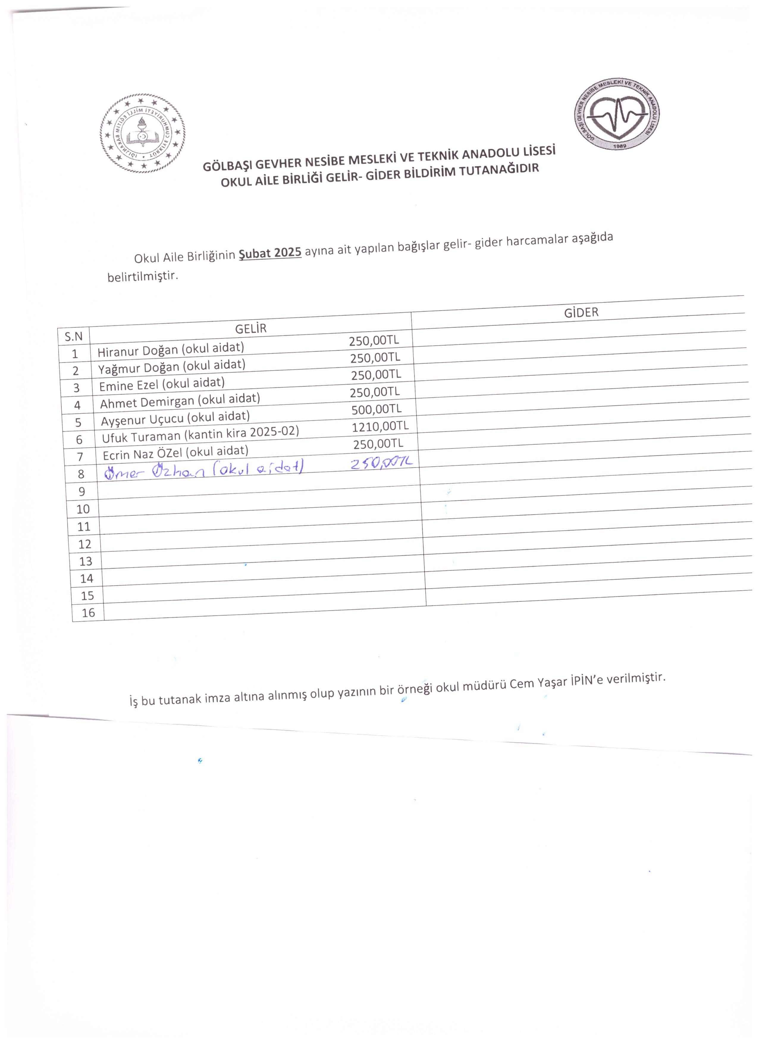 2025 şubat gelir gider